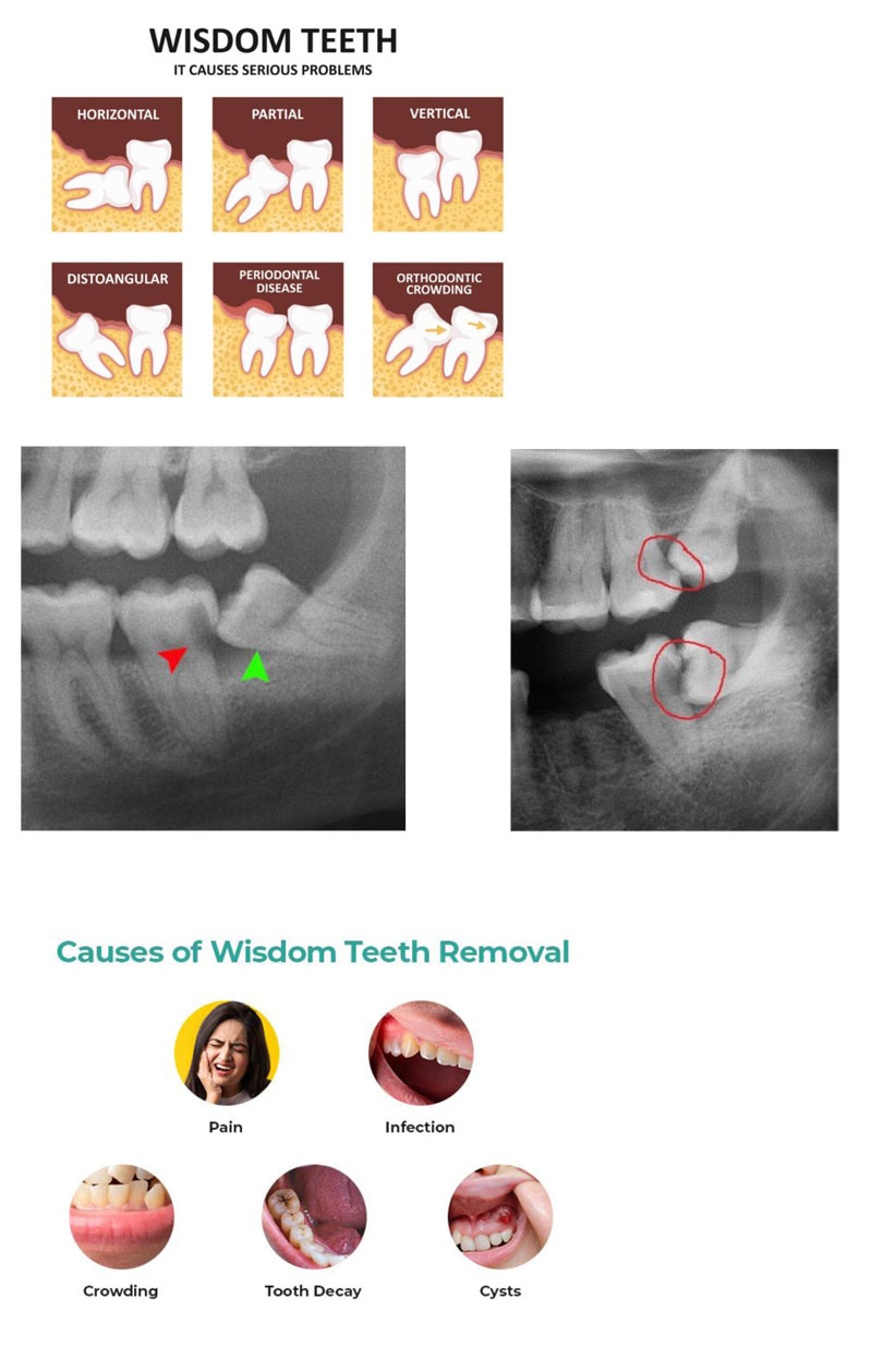 Wisdom teeth are the third set of molars at the back of the mouth, which typically emerge in late teens or early adulthood. Sometimes, these teeth cause problems due to lack of space, improper alignment, or impaction (when the teeth are unable to fully emerge through the gums). Wisdom teeth removal is a common procedure to alleviate these issues, prevent infection, and avoid complications like overcrowding or damage to adjacent teeth.